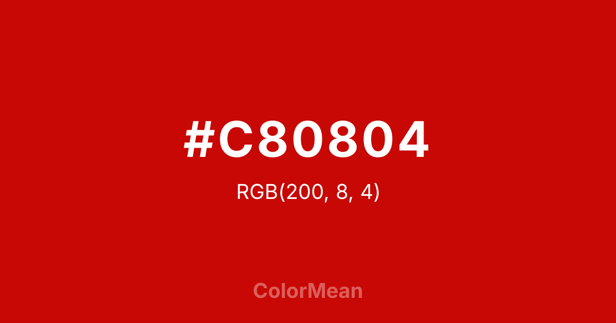 #C80804 RGB value is (200, 8, 4). The hex color red value is 200, green is 8, and blue is 4. Its HSL format shows a hue of 1°, saturation of 96 percent, and lightness of 40 percent. The CMYK process values are 0 percent, 96 percent, 98 percent, 22 percent.