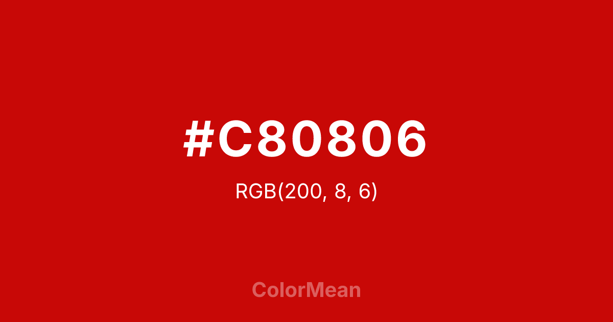 #C80806 RGB value is (200, 8, 6). The hex color red value is 200, green is 8, and blue is 6. Its HSL format shows a hue of 1°, saturation of 94 percent, and lightness of 40 percent. The CMYK process values are 0 percent, 96 percent, 97 percent, 22 percent.