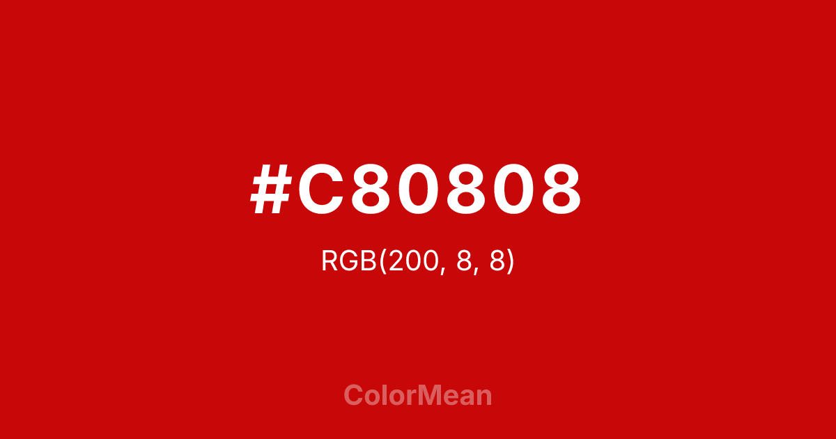 #C80808 RGB value is (200, 8, 8). The hex color red value is 200, green is 8, and blue is 8. Its HSL format shows a hue of 0°, saturation of 92 percent, and lightness of 41 percent. The CMYK process values are 0 percent, 96 percent, 96 percent, 22 percent.