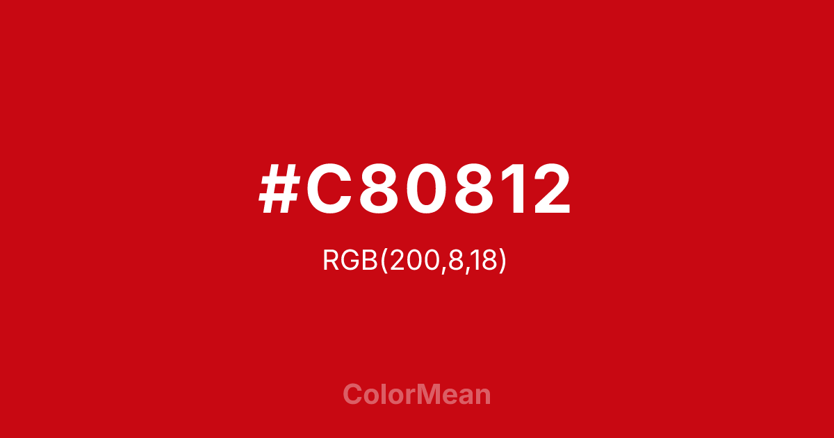 #C80812 RGB value is (200, 8, 18). The hex color red value is 200, green is 8, and blue is 18. Its HSL format shows a hue of 357°, saturation of 92 percent, and lightness of 41 percent. The CMYK process values are 0 percent, 96 percent, 91 percent, 22 percent.