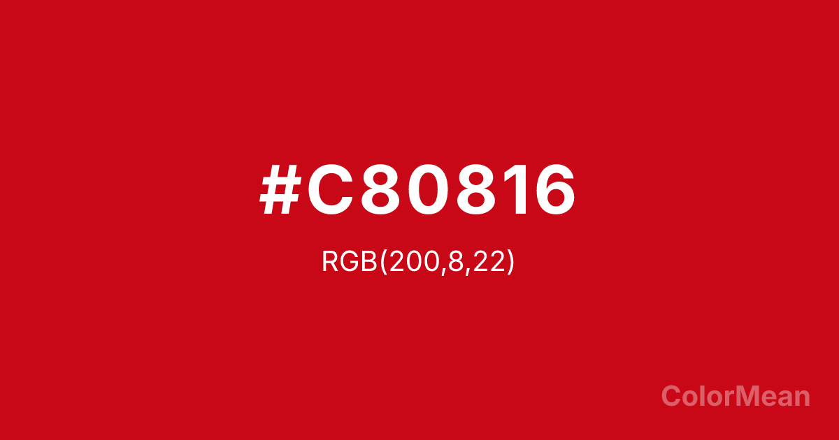 #C80816 RGB value is (200, 8, 22). The hex color red value is 200, green is 8, and blue is 22. Its HSL format shows a hue of 356°, saturation of 92 percent, and lightness of 41 percent. The CMYK process values are 0 percent, 96 percent, 89 percent, 22 percent.