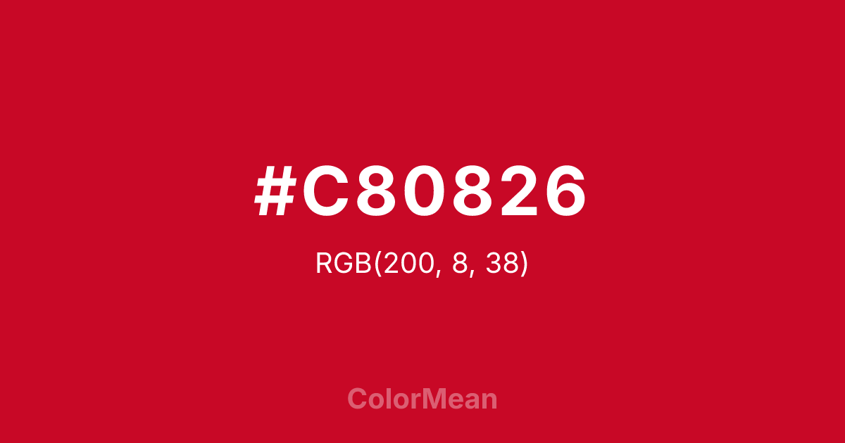#C80826 RGB value is (200, 8, 38). The hex color red value is 200, green is 8, and blue is 38. Its HSL format shows a hue of 351°, saturation of 92 percent, and lightness of 41 percent. The CMYK process values are 0 percent, 96 percent, 81 percent, 22 percent.