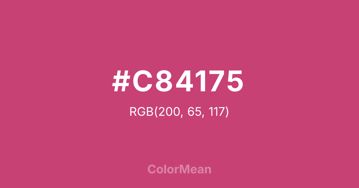 #C84175 RGB value is (200, 65, 117). The hex color red value is 200, green is 65, and blue is 117. Its HSL format shows a hue of 337°, saturation of 55 percent, and lightness of 52 percent. The CMYK process values are 0 percent, 68 percent, 42 percent, 22 percent.