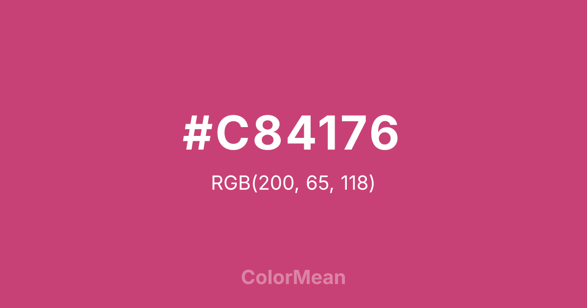 #C84176 RGB value is (200, 65, 118). The hex color red value is 200, green is 65, and blue is 118. Its HSL format shows a hue of 336°, saturation of 55 percent, and lightness of 52 percent. The CMYK process values are 0 percent, 68 percent, 41 percent, 22 percent.