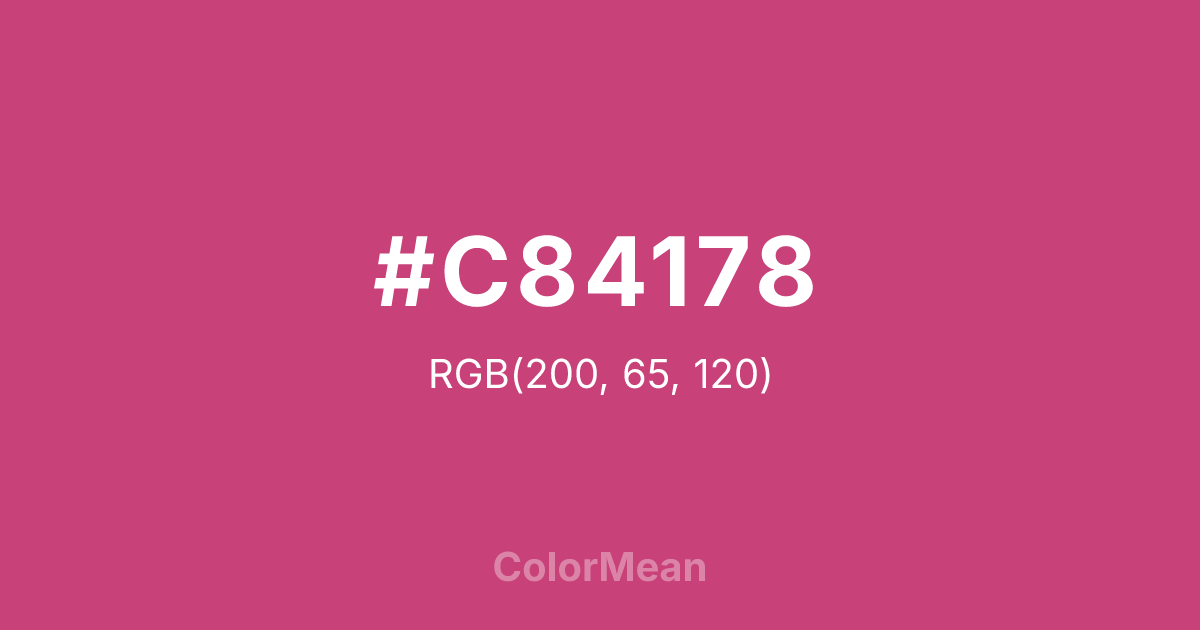 #C84178 RGB value is (200, 65, 120). The hex color red value is 200, green is 65, and blue is 120. Its HSL format shows a hue of 336°, saturation of 55 percent, and lightness of 52 percent. The CMYK process values are 0 percent, 68 percent, 40 percent, 22 percent.