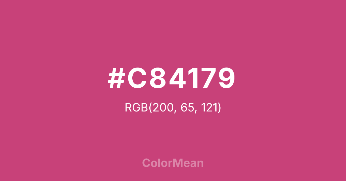 #C84179 RGB value is (200, 65, 121). The hex color red value is 200, green is 65, and blue is 121. Its HSL format shows a hue of 335°, saturation of 55 percent, and lightness of 52 percent. The CMYK process values are 0 percent, 68 percent, 40 percent, 22 percent.