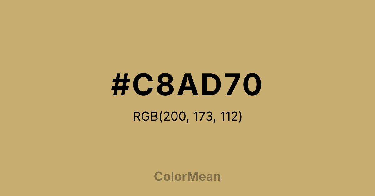 #C8AD70 RGB value is (200, 173, 112). The hex color red value is 200, green is 173, and blue is 112. Its HSL format shows a hue of 42°, saturation of 44 percent, and lightness of 61 percent. The CMYK process values are 0 percent, 13 percent, 44 percent, 22 percent.