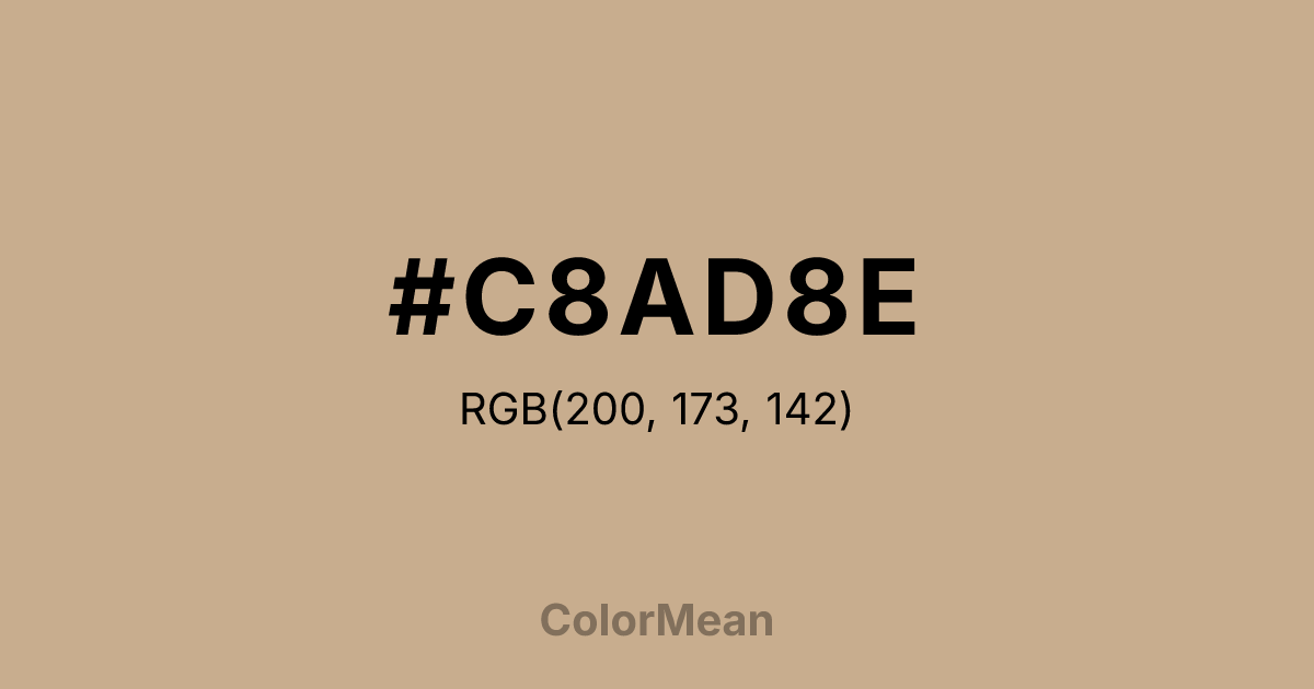 #C8AD8E RGB value is (200, 173, 142). The hex color red value is 200, green is 173, and blue is 142. Its HSL format shows a hue of 32°, saturation of 35 percent, and lightness of 67 percent. The CMYK process values are 0 percent, 13 percent, 29 percent, 22 percent.