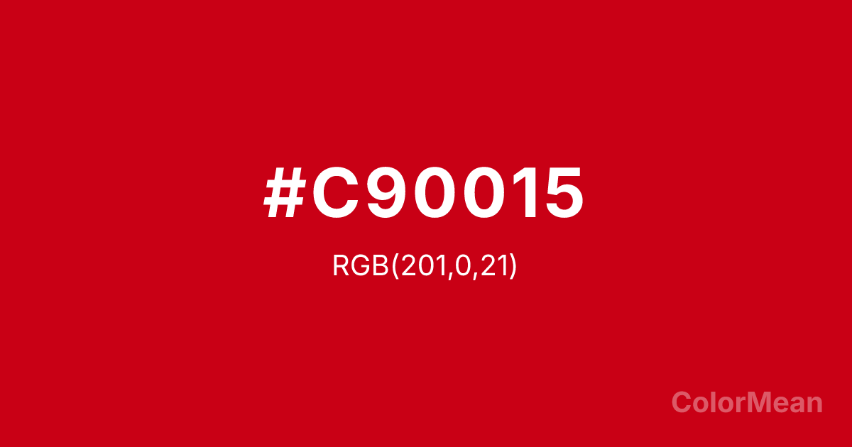 #C90015 RGB value is (201, 0, 21). The hex color red value is 201, green is 0, and blue is 21. Its HSL format shows a hue of 354°, saturation of 100 percent, and lightness of 39 percent. The CMYK process values are 0 percent, 100 percent, 90 percent, 21 percent.