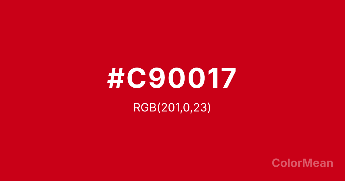 #C90017 RGB value is (201, 0, 23). The hex color red value is 201, green is 0, and blue is 23. Its HSL format shows a hue of 353°, saturation of 100 percent, and lightness of 39 percent. The CMYK process values are 0 percent, 100 percent, 89 percent, 21 percent.