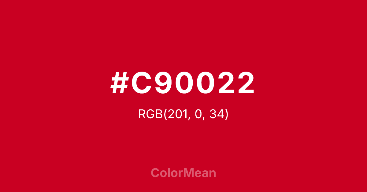 #C90022 RGB value is (201, 0, 34). The hex color red value is 201, green is 0, and blue is 34. Its HSL format shows a hue of 350°, saturation of 100 percent, and lightness of 39 percent. The CMYK process values are 0 percent, 100 percent, 83 percent, 21 percent.