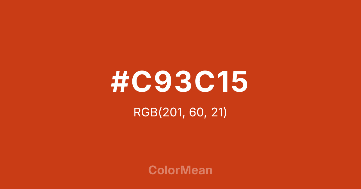 #C93C15 RGB value is (201, 60, 21). The hex color red value is 201, green is 60, and blue is 21. Its HSL format shows a hue of 13°, saturation of 81 percent, and lightness of 44 percent. The CMYK process values are 0 percent, 70 percent, 90 percent, 21 percent.