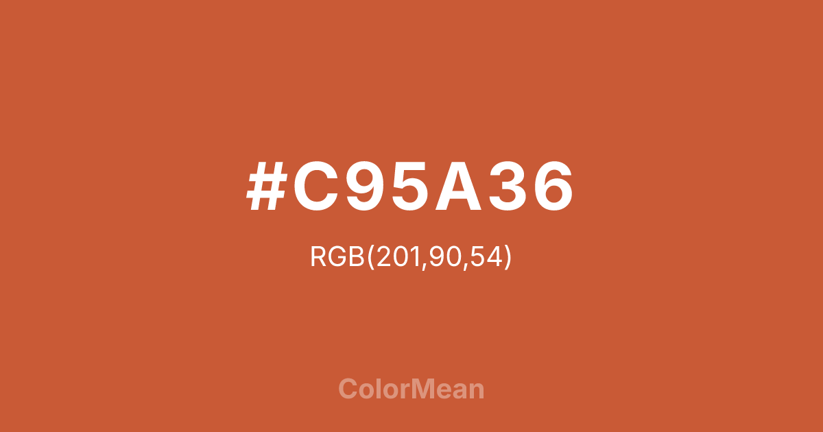 #C95A36 RGB value is (201, 90, 54). The hex color red value is 201, green is 90, and blue is 54. Its HSL format shows a hue of 15°, saturation of 58 percent, and lightness of 50 percent. The CMYK process values are 0 percent, 55 percent, 73 percent, 21 percent.