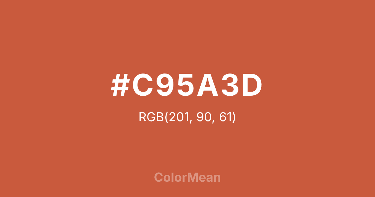 #C95A3D RGB value is (201, 90, 61). The hex color red value is 201, green is 90, and blue is 61. Its HSL format shows a hue of 12°, saturation of 56 percent, and lightness of 51 percent. The CMYK process values are 0 percent, 55 percent, 70 percent, 21 percent.