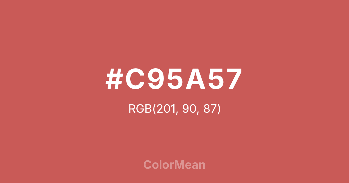 #C95A57 RGB value is (201, 90, 87). The hex color red value is 201, green is 90, and blue is 87. Its HSL format shows a hue of 2°, saturation of 51 percent, and lightness of 56 percent. The CMYK process values are 0 percent, 55 percent, 57 percent, 21 percent.