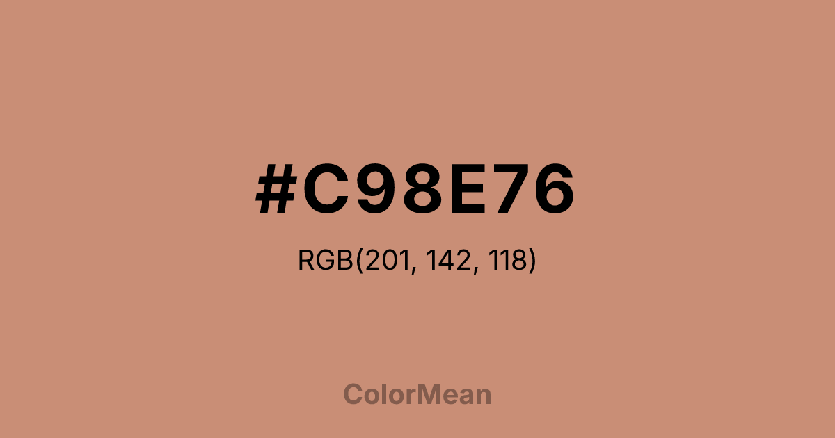 #C98E76 RGB value is (201, 142, 118). The hex color red value is 201, green is 142, and blue is 118. Its HSL format shows a hue of 17°, saturation of 43 percent, and lightness of 63 percent. The CMYK process values are 0 percent, 29 percent, 41 percent, 21 percent.