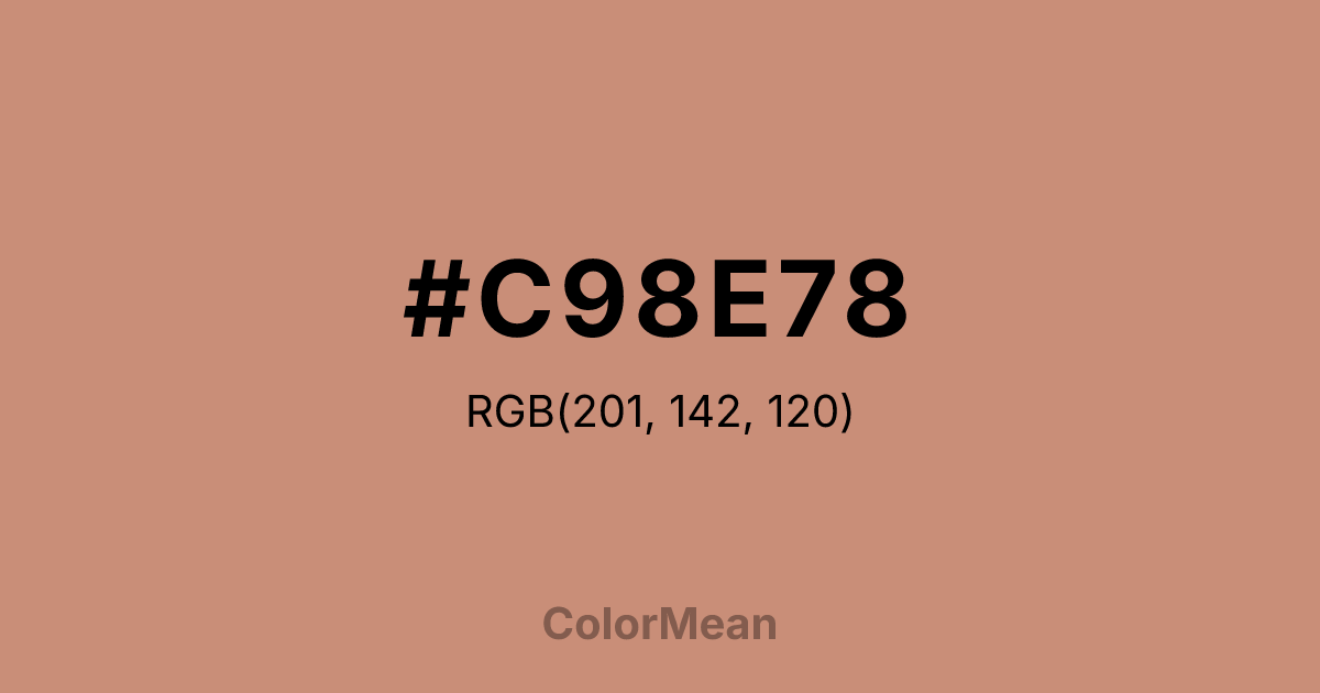 #C98E78 RGB value is (201, 142, 120). The hex color red value is 201, green is 142, and blue is 120. Its HSL format shows a hue of 16°, saturation of 43 percent, and lightness of 63 percent. The CMYK process values are 0 percent, 29 percent, 40 percent, 21 percent.