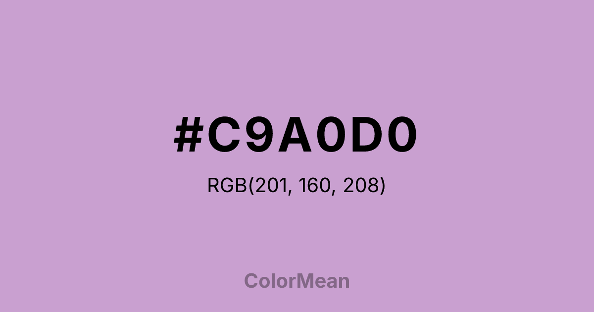 #C9A0D0 RGB value is (201, 160, 208). The hex color red value is 201, green is 160, and blue is 208. Its HSL format shows a hue of 291°, saturation of 34 percent, and lightness of 72 percent. The CMYK process values are 3 percent, 23 percent, 0 percent, 18 percent.