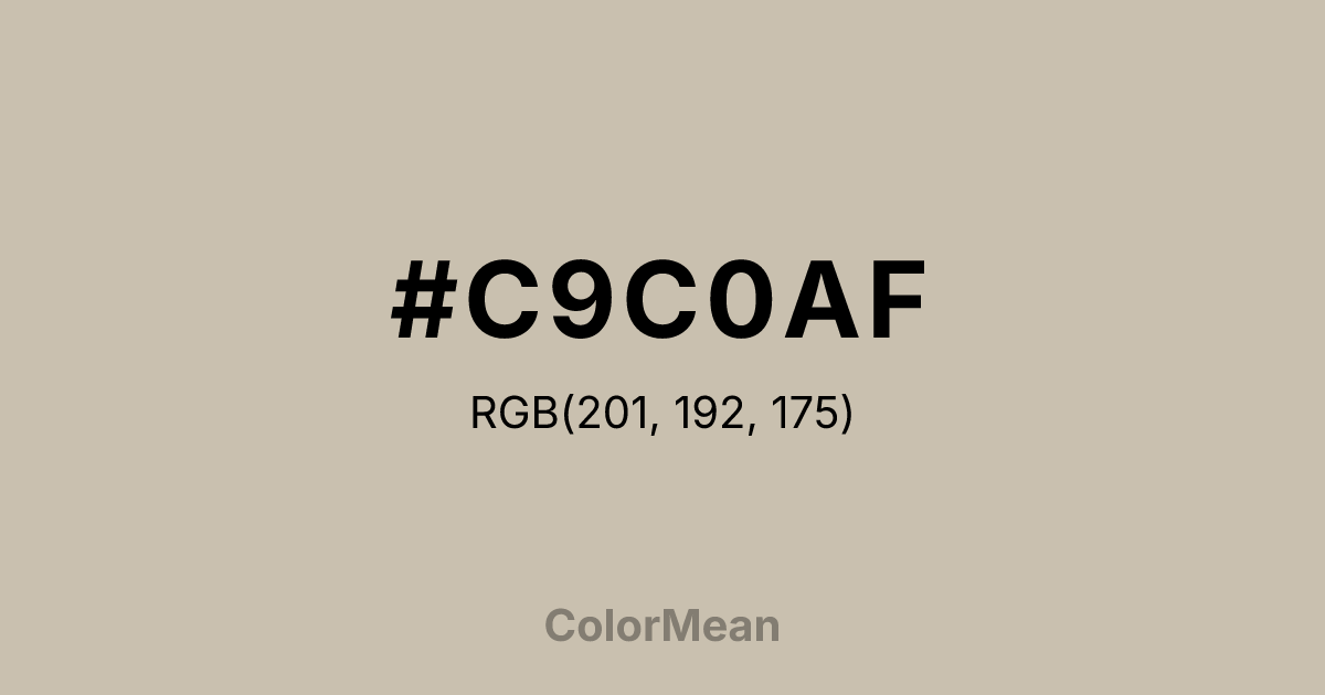 #C9C0AF RGB value is (201, 192, 175). The hex color red value is 201, green is 192, and blue is 175. Its HSL format shows a hue of 39°, saturation of 19 percent, and lightness of 74 percent. The CMYK process values are 0 percent, 4 percent, 13 percent, 21 percent.