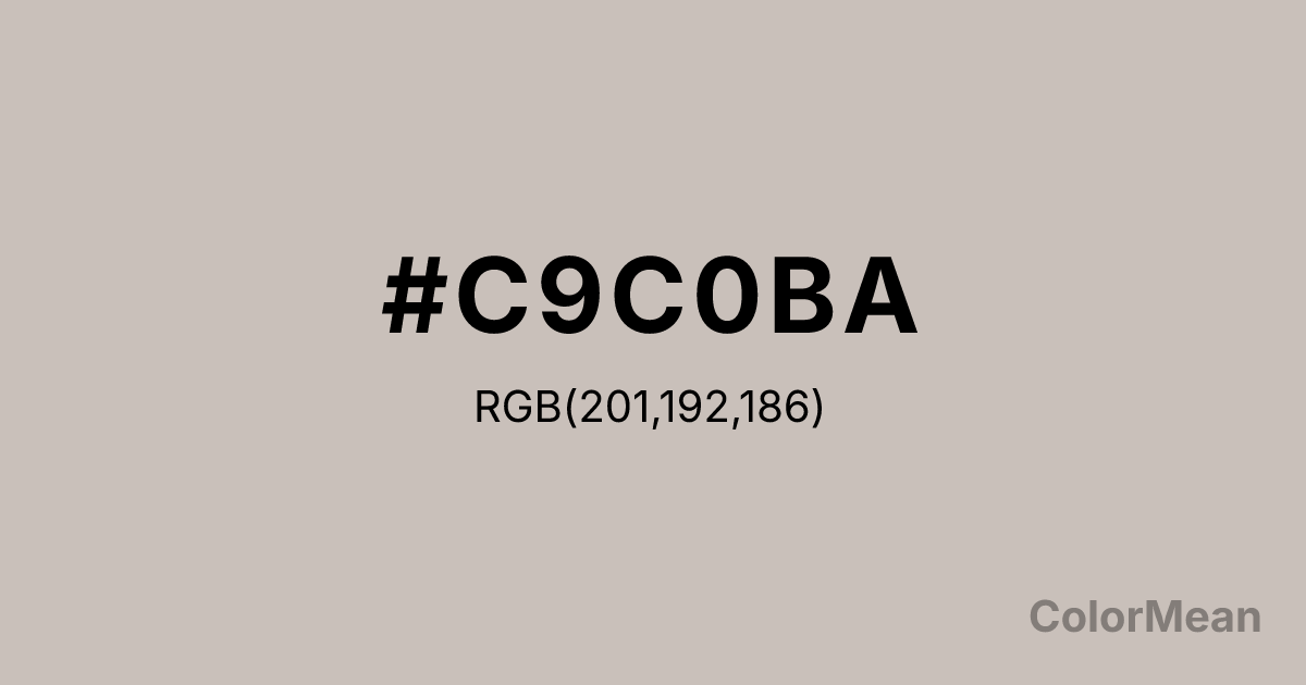 #C9C0BA RGB value is (201, 192, 186). The hex color red value is 201, green is 192, and blue is 186. Its HSL format shows a hue of 24°, saturation of 12 percent, and lightness of 76 percent. The CMYK process values are 0 percent, 4 percent, 7 percent, 21 percent.