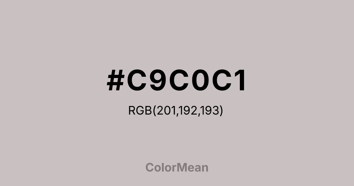 #C9C0C1 RGB value is (201, 192, 193). The hex color red value is 201, green is 192, and blue is 193. Its HSL format shows a hue of 353°, saturation of 8 percent, and lightness of 77 percent. The CMYK process values are 0 percent, 4 percent, 4 percent, 21 percent.