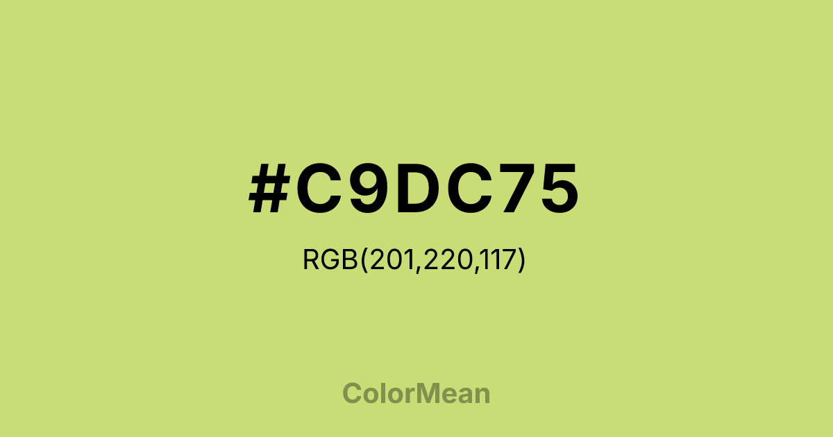 #C9DC75 RGB value is (201, 220, 117). The hex color red value is 201, green is 220, and blue is 117. Its HSL format shows a hue of 71°, saturation of 60 percent, and lightness of 66 percent. The CMYK process values are 9 percent, 0 percent, 47 percent, 14 percent.