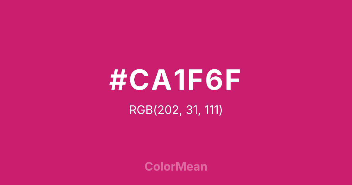 #CA1F6F RGB value is (202, 31, 111). The hex color red value is 202, green is 31, and blue is 111. Its HSL format shows a hue of 332°, saturation of 73 percent, and lightness of 46 percent. The CMYK process values are 0 percent, 85 percent, 45 percent, 21 percent.