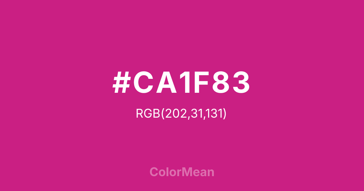 #CA1F83 RGB value is (202, 31, 131). The hex color red value is 202, green is 31, and blue is 131. Its HSL format shows a hue of 325°, saturation of 73 percent, and lightness of 46 percent. The CMYK process values are 0 percent, 85 percent, 35 percent, 21 percent.