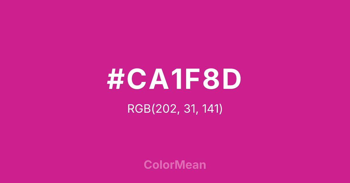 #CA1F8D RGB value is (202, 31, 141). The hex color red value is 202, green is 31, and blue is 141. Its HSL format shows a hue of 321°, saturation of 73 percent, and lightness of 46 percent. The CMYK process values are 0 percent, 85 percent, 30 percent, 21 percent.