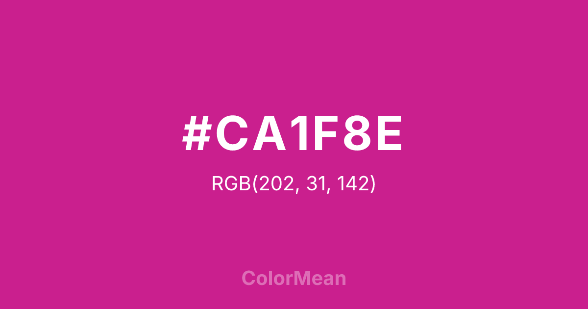 #CA1F8E RGB value is (202, 31, 142). The hex color red value is 202, green is 31, and blue is 142. Its HSL format shows a hue of 321°, saturation of 73 percent, and lightness of 46 percent. The CMYK process values are 0 percent, 85 percent, 30 percent, 21 percent.