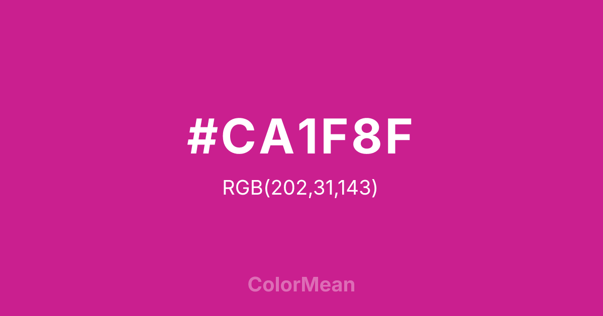 #CA1F8F RGB value is (202, 31, 143). The hex color red value is 202, green is 31, and blue is 143. Its HSL format shows a hue of 321°, saturation of 73 percent, and lightness of 46 percent. The CMYK process values are 0 percent, 85 percent, 29 percent, 21 percent.