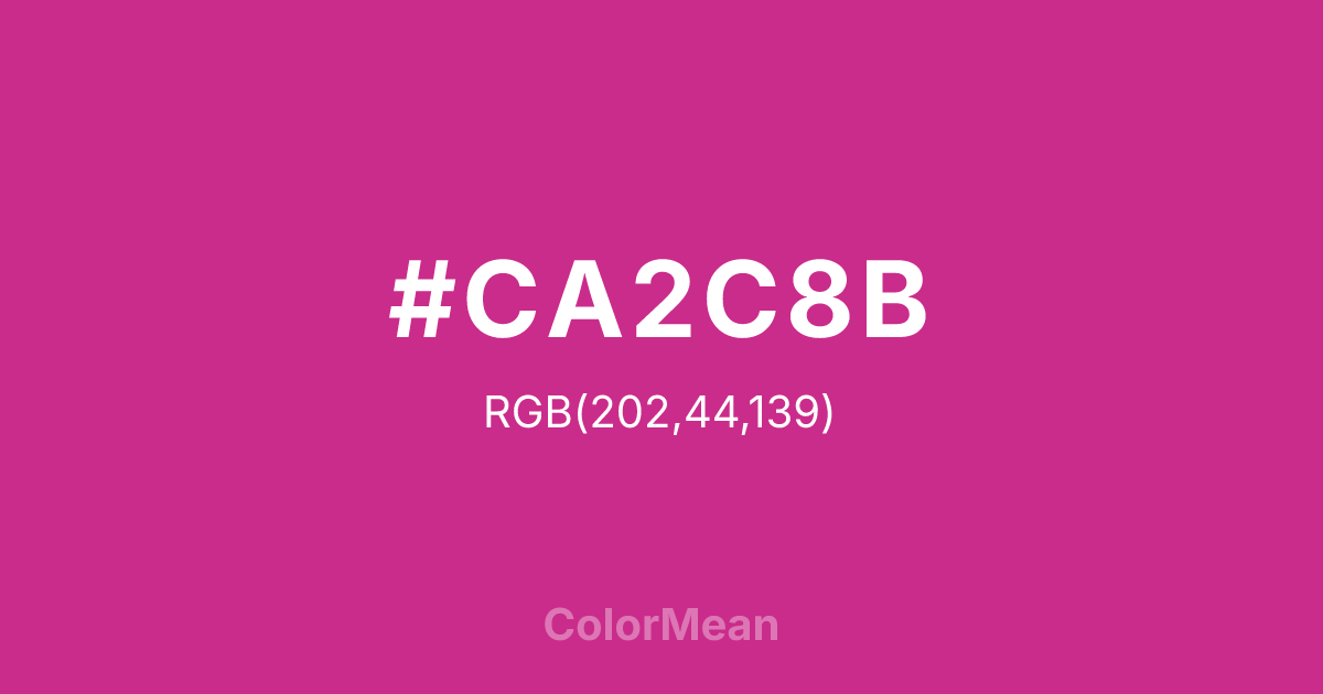 #CA2C8B RGB value is (202, 44, 139). The hex color red value is 202, green is 44, and blue is 139. Its HSL format shows a hue of 324°, saturation of 64 percent, and lightness of 48 percent. The CMYK process values are 0 percent, 78 percent, 31 percent, 21 percent.