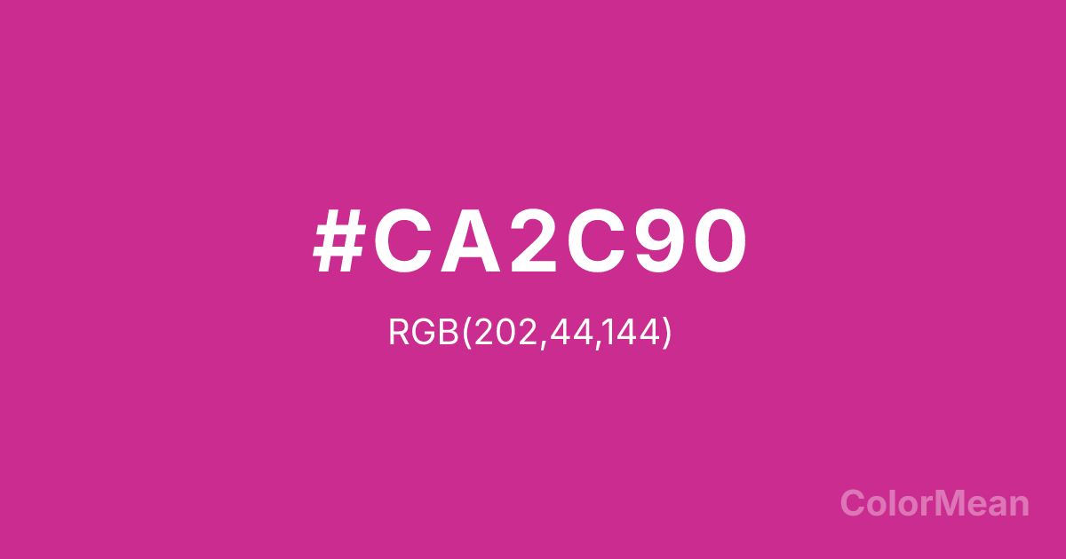 #CA2C90 RGB value is (202, 44, 144). The hex color red value is 202, green is 44, and blue is 144. Its HSL format shows a hue of 322°, saturation of 64 percent, and lightness of 48 percent. The CMYK process values are 0 percent, 78 percent, 29 percent, 21 percent.