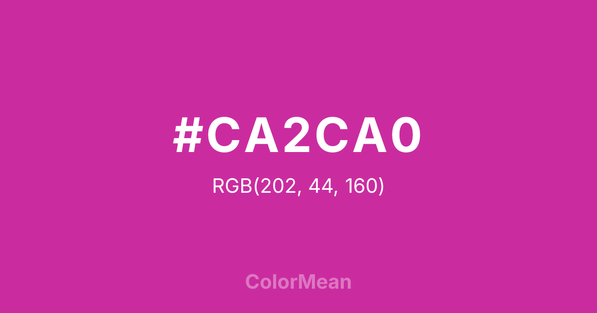 #CA2CA0 RGB value is (202, 44, 160). The hex color red value is 202, green is 44, and blue is 160. Its HSL format shows a hue of 316°, saturation of 64 percent, and lightness of 48 percent. The CMYK process values are 0 percent, 78 percent, 21 percent, 21 percent.