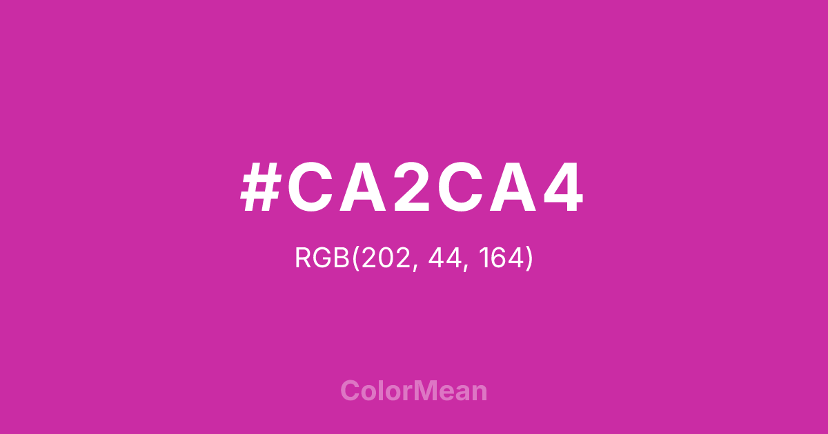 #CA2CA4 RGB value is (202, 44, 164). The hex color red value is 202, green is 44, and blue is 164. Its HSL format shows a hue of 314°, saturation of 64 percent, and lightness of 48 percent. The CMYK process values are 0 percent, 78 percent, 19 percent, 21 percent.
