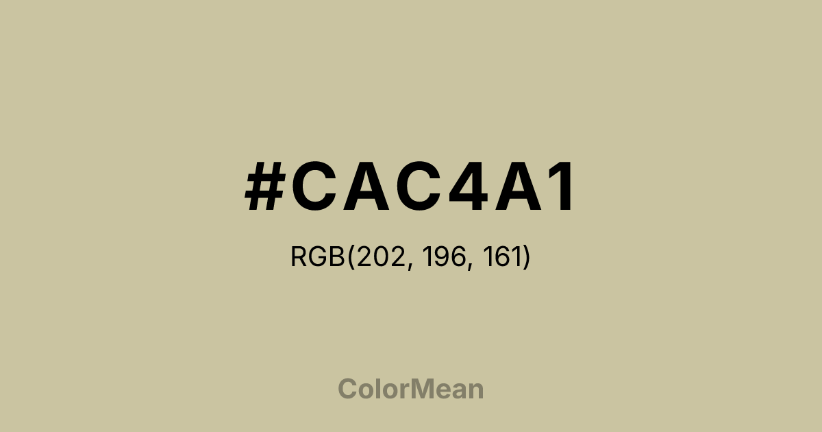 #CAC4A1 RGB value is (202, 196, 161). The hex color red value is 202, green is 196, and blue is 161. Its HSL format shows a hue of 51°, saturation of 28 percent, and lightness of 71 percent. The CMYK process values are 0 percent, 3 percent, 20 percent, 21 percent.