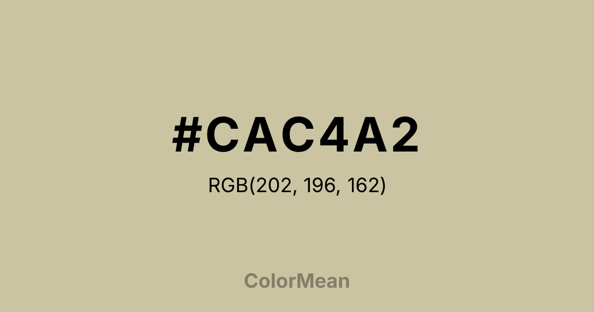 #CAC4A2 RGB value is (202, 196, 162). The hex color red value is 202, green is 196, and blue is 162. Its HSL format shows a hue of 51°, saturation of 27 percent, and lightness of 71 percent. The CMYK process values are 0 percent, 3 percent, 20 percent, 21 percent.