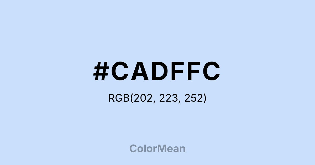 #CADFFC RGB value is (202, 223, 252). The hex color red value is 202, green is 223, and blue is 252. Its HSL format shows a hue of 215°, saturation of 89 percent, and lightness of 89 percent. The CMYK process values are 20 percent, 12 percent, 0 percent, 1 percent.