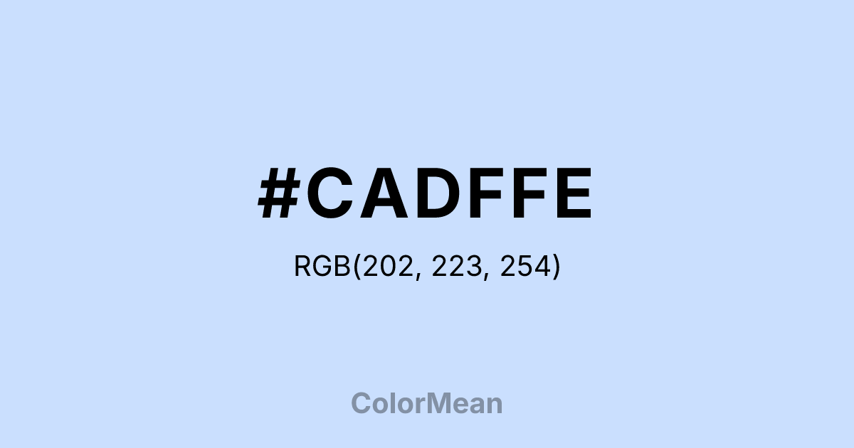 #CADFFE RGB value is (202, 223, 254). The hex color red value is 202, green is 223, and blue is 254. Its HSL format shows a hue of 216°, saturation of 96 percent, and lightness of 89 percent. The CMYK process values are 20 percent, 12 percent, 0 percent, 0 percent.