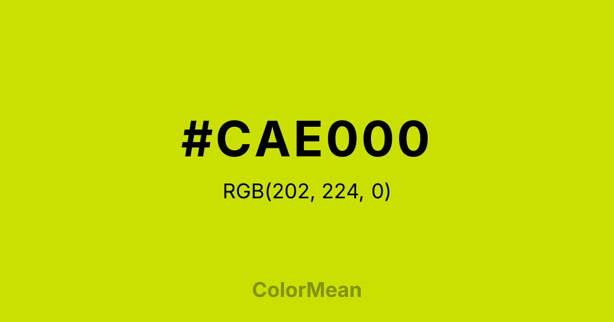 #CAE000 RGB value is (202, 224, 0). The hex color red value is 202, green is 224, and blue is 0. Its HSL format shows a hue of 66°, saturation of 100 percent, and lightness of 44 percent. The CMYK process values are 10 percent, 0 percent, 100 percent, 12 percent.