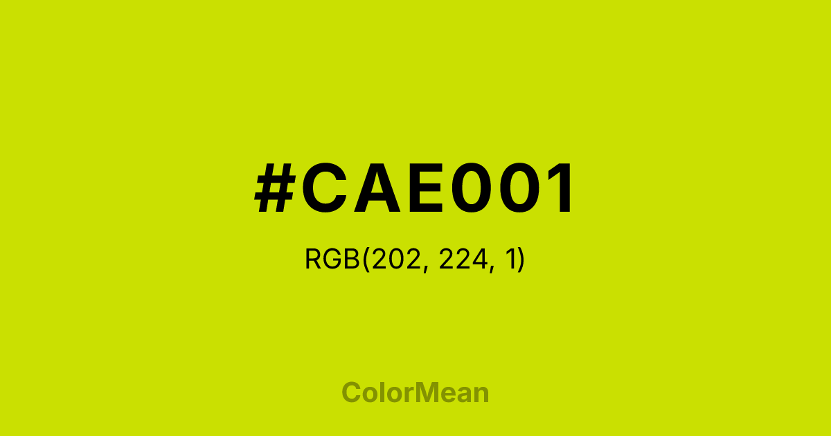 #CAE001 RGB value is (202, 224, 1). The hex color red value is 202, green is 224, and blue is 1. Its HSL format shows a hue of 66°, saturation of 99 percent, and lightness of 44 percent. The CMYK process values are 10 percent, 0 percent, 100 percent, 12 percent.