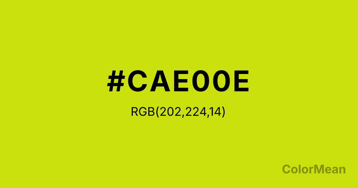 #CAE00E RGB value is (202, 224, 14). The hex color red value is 202, green is 224, and blue is 14. Its HSL format shows a hue of 66°, saturation of 88 percent, and lightness of 47 percent. The CMYK process values are 10 percent, 0 percent, 94 percent, 12 percent.
