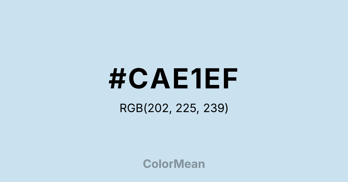 #CAE1EF RGB value is (202, 225, 239). The hex color red value is 202, green is 225, and blue is 239. Its HSL format shows a hue of 203°, saturation of 54 percent, and lightness of 86 percent. The CMYK process values are 15 percent, 6 percent, 0 percent, 6 percent.