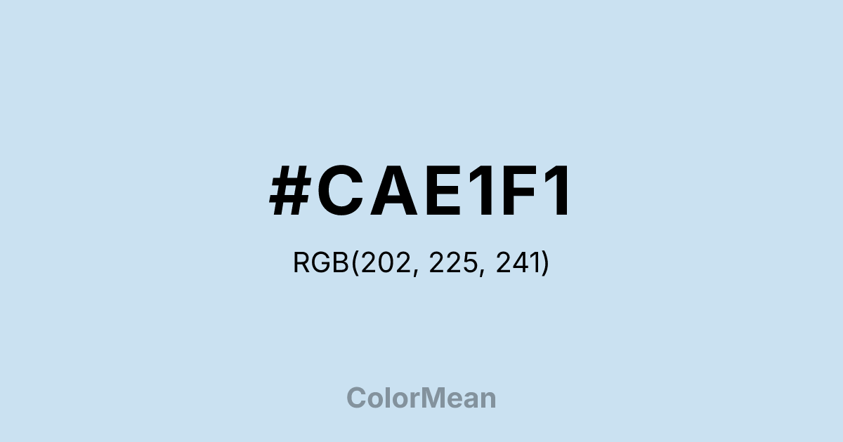 #CAE1F1 RGB value is (202, 225, 241). The hex color red value is 202, green is 225, and blue is 241. Its HSL format shows a hue of 205°, saturation of 58 percent, and lightness of 87 percent. The CMYK process values are 16 percent, 7 percent, 0 percent, 5 percent.