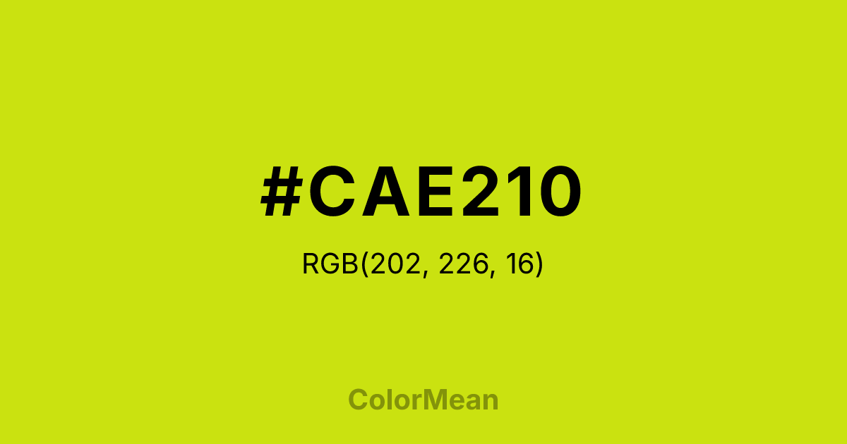 #CAE210 RGB value is (202, 226, 16). The hex color red value is 202, green is 226, and blue is 16. Its HSL format shows a hue of 67°, saturation of 87 percent, and lightness of 47 percent. The CMYK process values are 11 percent, 0 percent, 93 percent, 11 percent.
