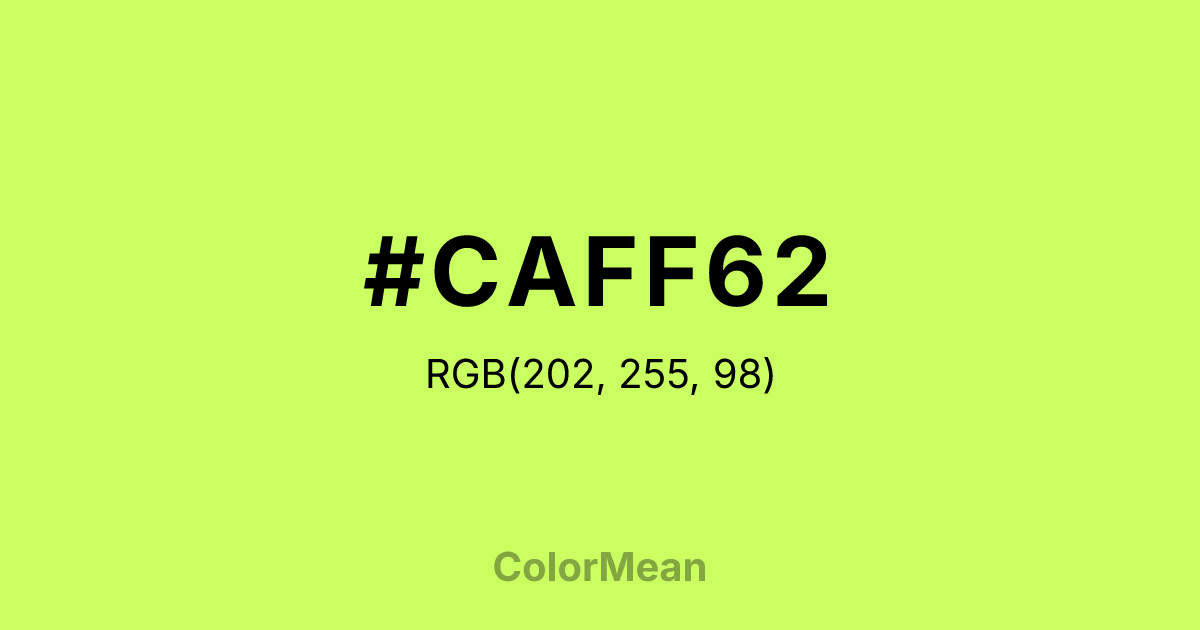 #CAFF62 RGB value is (202, 255, 98). The hex color red value is 202, green is 255, and blue is 98. Its HSL format shows a hue of 80°, saturation of 100 percent, and lightness of 69 percent. The CMYK process values are 21 percent, 0 percent, 62 percent, 0 percent.