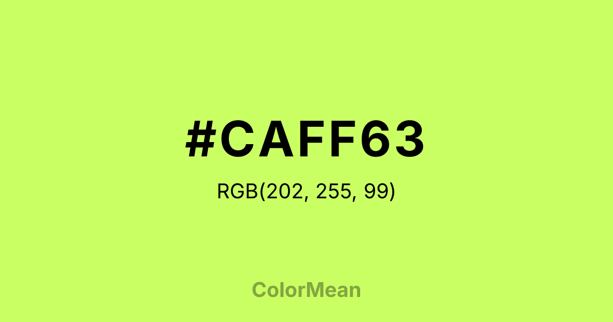 #CAFF63 RGB value is (202, 255, 99). The hex color red value is 202, green is 255, and blue is 99. Its HSL format shows a hue of 80°, saturation of 100 percent, and lightness of 69 percent. The CMYK process values are 21 percent, 0 percent, 61 percent, 0 percent.