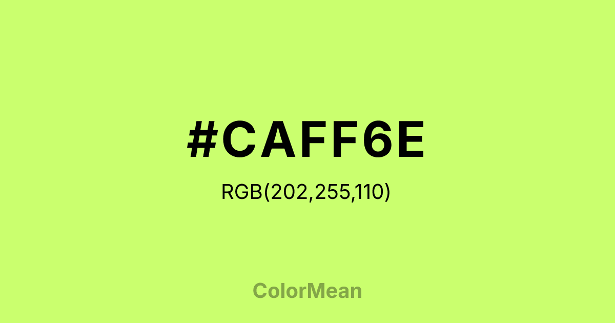 #CAFF6E RGB value is (202, 255, 110). The hex color red value is 202, green is 255, and blue is 110. Its HSL format shows a hue of 82°, saturation of 100 percent, and lightness of 72 percent. The CMYK process values are 21 percent, 0 percent, 57 percent, 0 percent.