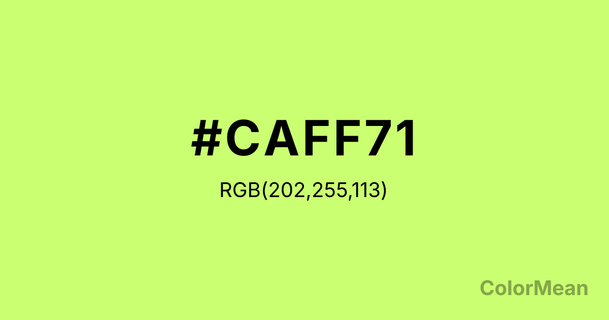 #CAFF71 RGB value is (202, 255, 113). The hex color red value is 202, green is 255, and blue is 113. Its HSL format shows a hue of 82°, saturation of 100 percent, and lightness of 72 percent. The CMYK process values are 21 percent, 0 percent, 56 percent, 0 percent.