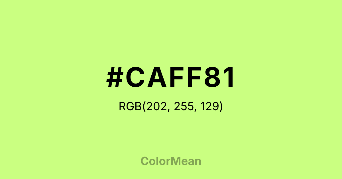 #CAFF81 RGB value is (202, 255, 129). The hex color red value is 202, green is 255, and blue is 129. Its HSL format shows a hue of 85°, saturation of 100 percent, and lightness of 75 percent. The CMYK process values are 21 percent, 0 percent, 49 percent, 0 percent.